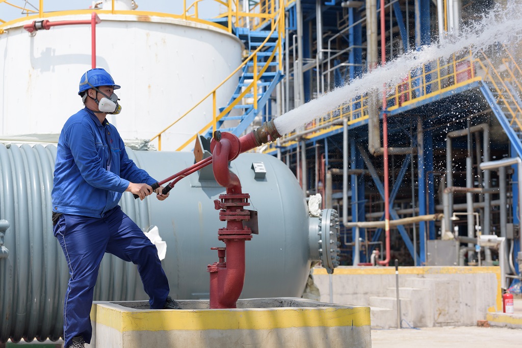 演练现场,公司的应急抢险救援队反应迅速,各司其职,有序地进行着实战任务。为配合完成此次演练,公司消防队在接到救援电话后,迅速赶到事故现场,对起火外围的设备进行喷水降温,防止周边槽罐、反应釜出现高温事故。在应急抢险救援队的努力下,事故现场着火点被有效扑灭,物料泄漏点也都处理完成。事故险情及环境影响全部排除。应急总指挥宣布聚合装置着火事故综合性应急预案演练结束。