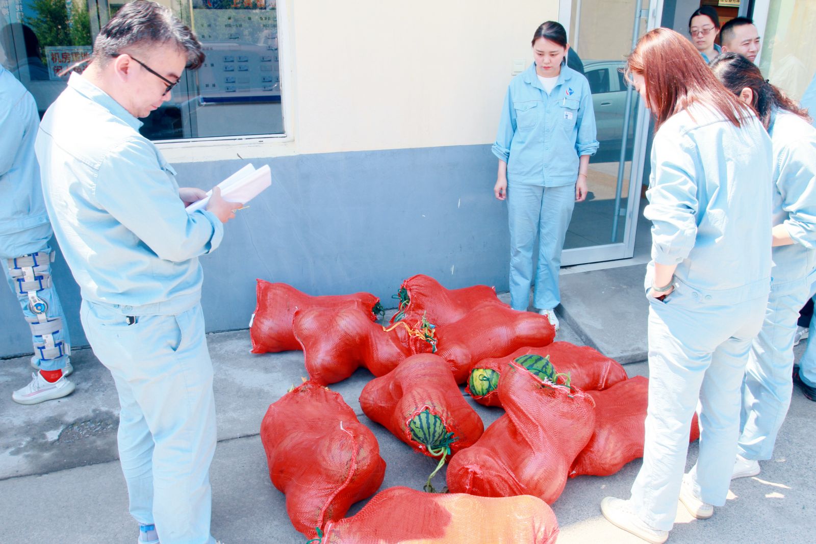 6月14日下午,在古天乐太阳集团城工会主席冷晓燕的带领下,载着几百多斤西瓜和成箱可乐的面包车驶进公司。